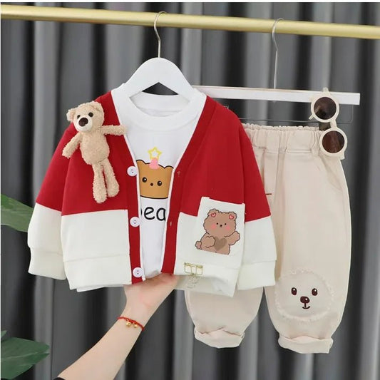 Kız Çocuk 3 Parça Ayıcık Detaylı Pamuklu Takım - Pembe Kırmızı
