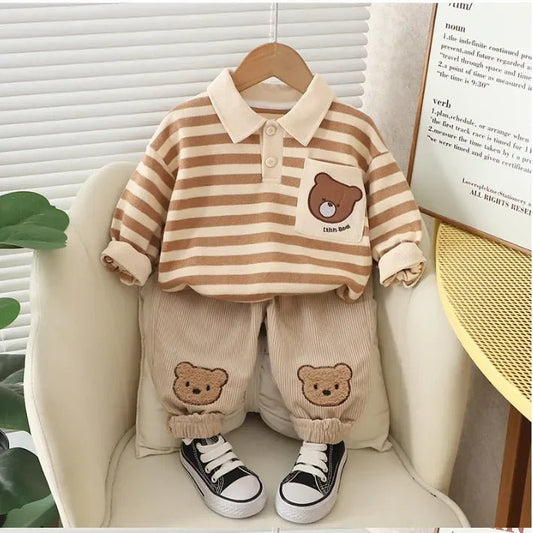 Çizgili Pamuklu Üst ve Nakışlı Kadife Pantolon Çocuk Takımı