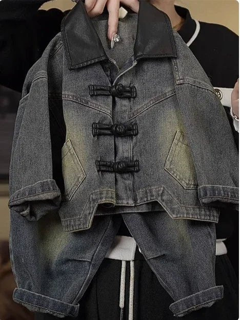 Çocuk Kot Ceket ve Pantolon Takımı Rahat Dayanıklı Dikiş Detaylı
