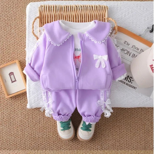 Dantel Detaylı 3 Parça Kız Çocuk Takımı - Rahat Pembe Lila