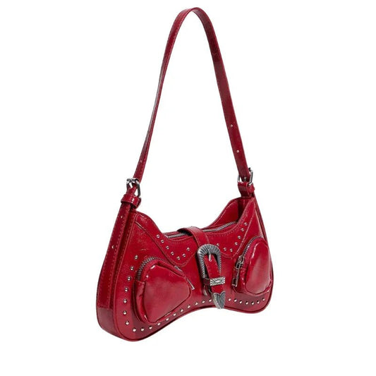 Retro Kırmızı Perçinli Kadın Omuz Çantası Şık PU Deri