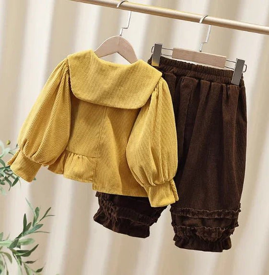 Sarı Kahverengi Kadife Kız Çocuk Takım 2–7 Yaş Yumuşak Esnek